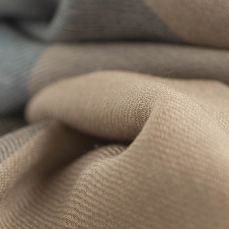 Checkered cashmere stole in blue, toffee, beige and grey.