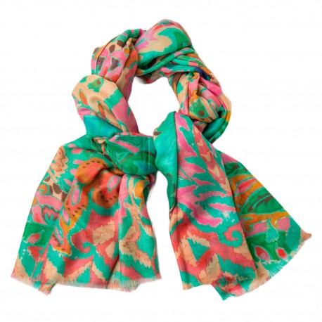 Cashmere shawl with print in light green, orange and pink. 200 x 90 cm.